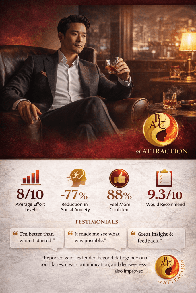 The ABCs of Attraction was designed specifically to address this gap. Rather than encouraging Asian men to imitate exaggerated personas or abandon their identity, the system teaches them how to express intent, confidence, and leadership in ways that are socially readable within Western dating contexts.