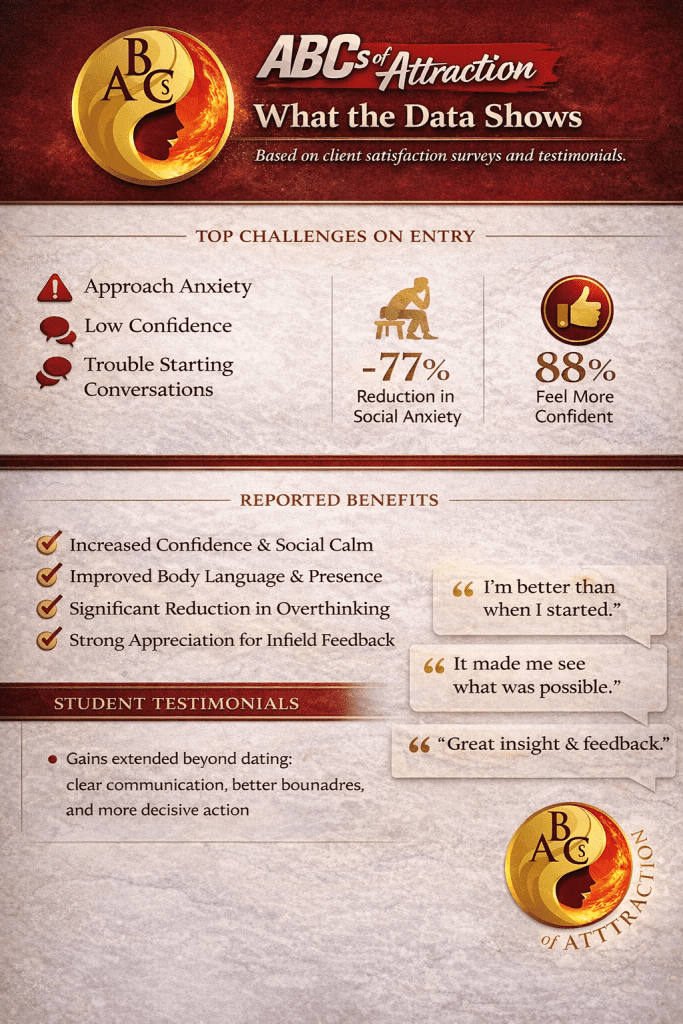 Client satisfaction data reinforces this outcome. Students report that the program helps them integrate body language, conversation, and intent into a cohesive presence, rather than relying on tricks or scripts. Many cite confidence and body language as their biggest gains, with instructors and infield feedback repeatedly mentioned as key factors in that development.