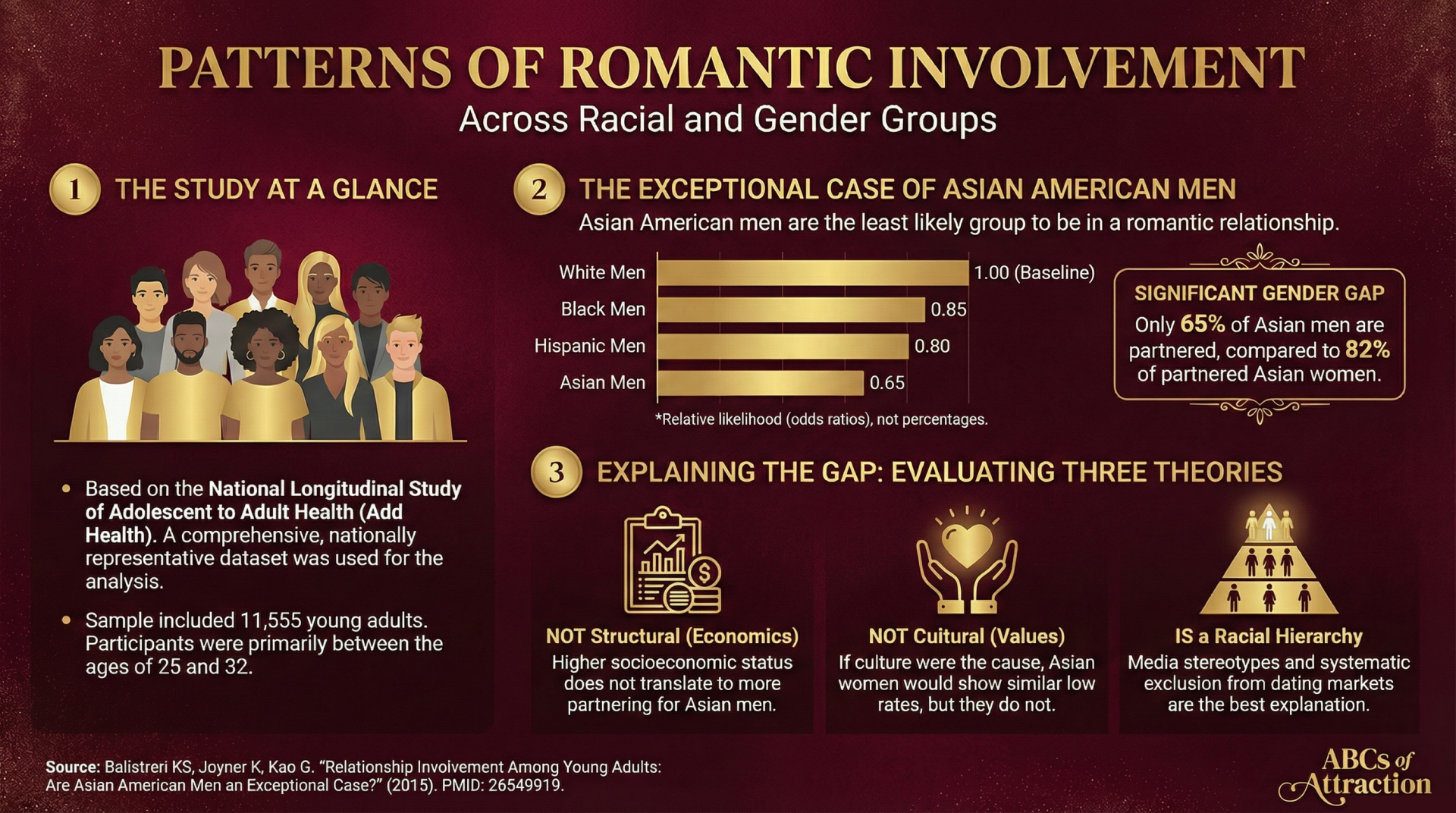Data has long supported this, showing Asian American men were historically less likely to be in relationships than their peers, regardless of their credentials.