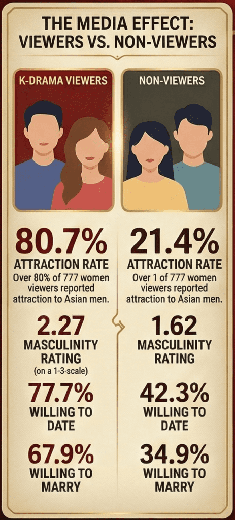 - Willingness to Date: 77.7% of viewers expressed a willingness to date Asian men, nearly double the 42.3% reported by non-viewers.