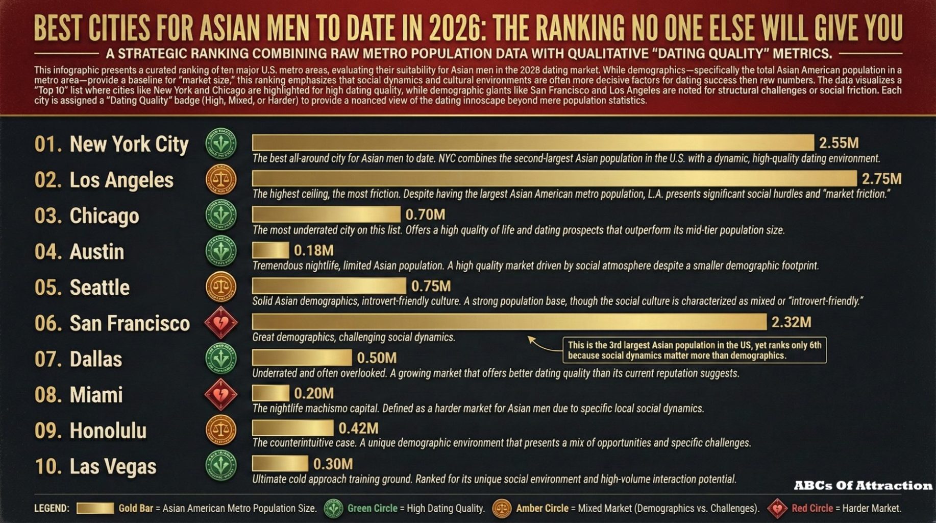 - Los Angeles. Highest ceiling, most friction. Massive Asian population across multiple neighborhoods. Brutal geographic logistics, high flake rate, entrenched social circles. Best for Asian men who are at intermediate level or above and want access to the largest Asian female population in the continental US.