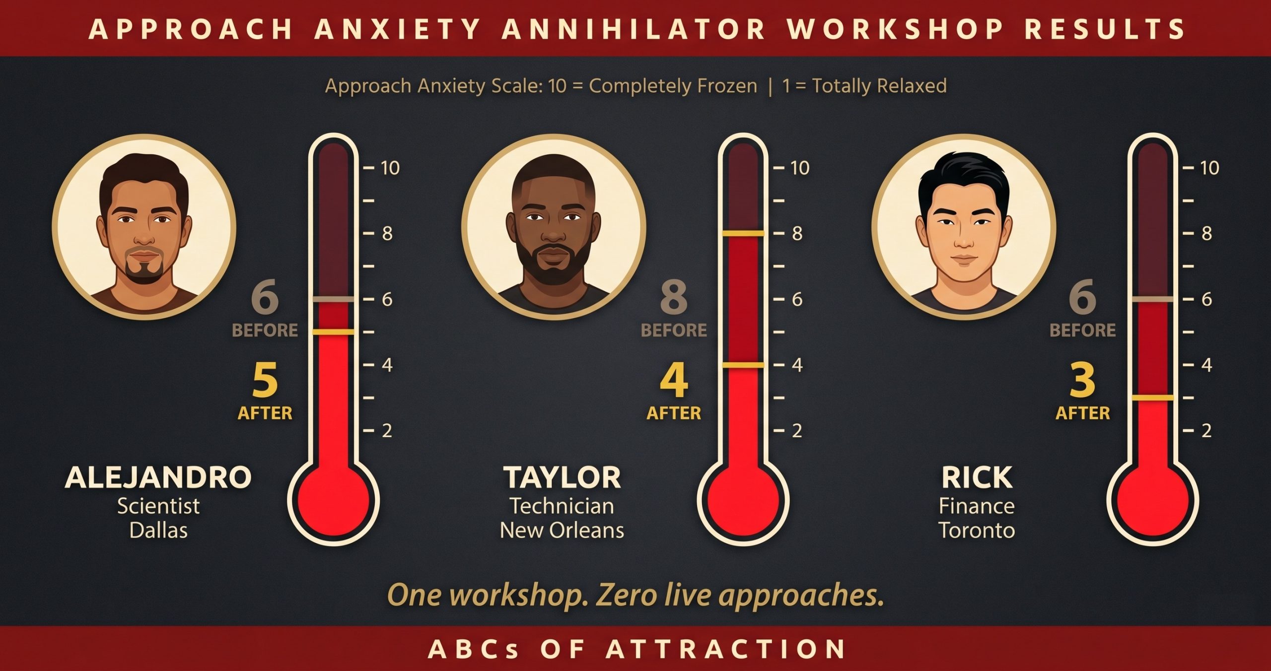 Approach Anxiety Annihilator workshop results: Alejandro (6 to 5), Taylor (8 to 4), Rick (6 to 3). One session. Zero live approaches.
