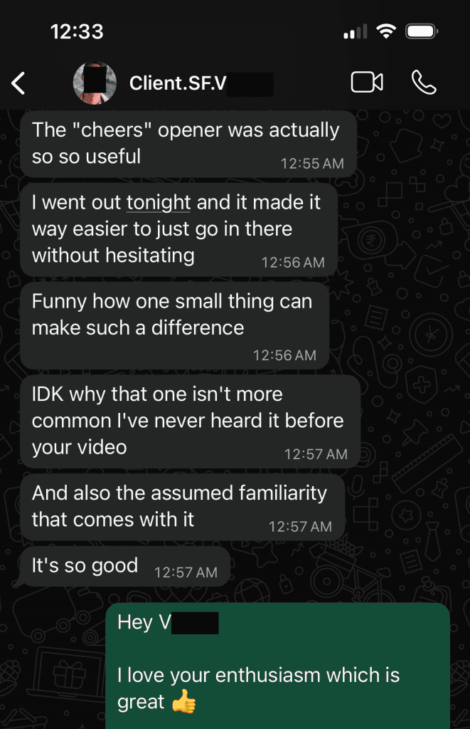 Student practices the Kickstarter Opener from the Prebootcamp Homestudy Course and gets instant results