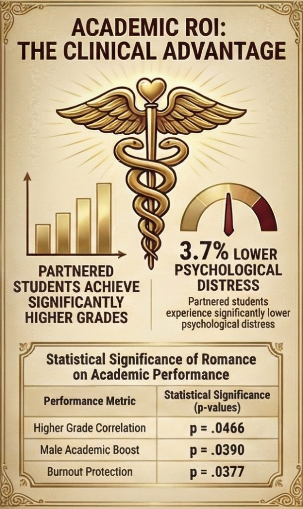 According to published research in the Journal of Behavioral Health, medical students in romantic relationships had significantly higher grades than single students (p = .0466). For men specifically, the academic boost was even stronger: partnered males showed significantly higher mean grades than single males (p = .039). Students in the most satisfying relationships had better grades and fewer course retakes (F-ratio = 203.88).