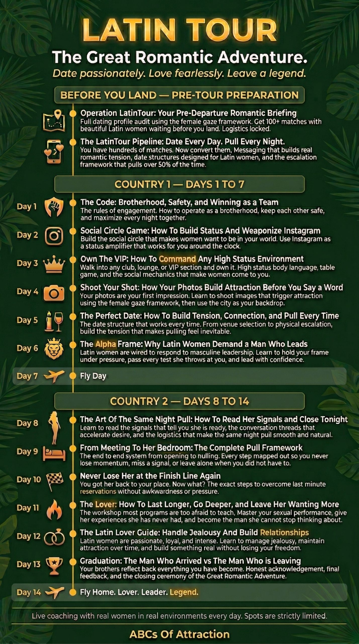 It’s a two-week bootcamp where we take Asian men on a tour of Latin America, teaching you about women and how to approach, romance, and handle relationships with them along the way.